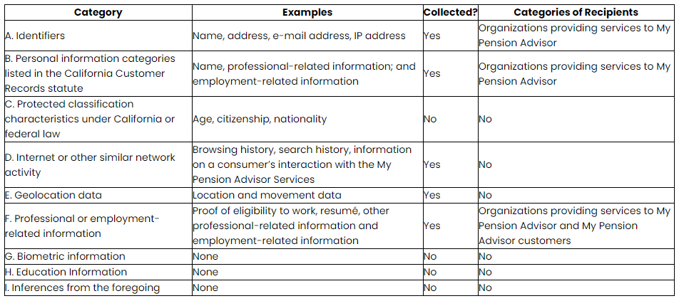 We collect information (including personal information and Traffic Data) when you use and interact with the Trusted Retirement Help Services, and in some cases from third party sources. Such means of collection include: